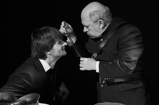 Куда удивительнее, что эти слезы вообще оказались возможны. Буквально с первой сцены спектакль «Что делать?» демонстрирует недюжинные комические потенции. Со времен «Жмурок» Алексея Балабанова, кажется, не было второго такого случая, чтобы народные артисты безвозвратно улетали из кадра, не успев произнести пару реплик. Георгий Штиль немножко покряхтел на стуле, и вот он уже кланяется у правой кулисы. Ируте Венгалите кидает свое веское проклятие «новым людям» и тоже исчезает. Андрей Шарков очень забавно изображает священника, богобоязненно крестясь от каждого звука, но, выйдя на первый план на несколько секунд, тут же стремится за кулисы. Секстет тупых полицейских (Сергей Лосев, Евгений Чудаков, Валерий Дегтярь, Анатолий Петров, Василий Реутов и примкнувший к ним Евгений Славский) задерживается перед публикой чуть дольше, но то, что могло бы стать гомерически смешным дивертисментом, как будто закутано в поролон. Комические оценки так тихи и осторожны, как будто в городе объявлен траур и шутить неловко. Сорвать этот заговор серьезности удается только Рахметову. Дебютант Виктор Княжев появляется на сцене с феерическим номером, почти моноспектаклем. Революционный аскет и богатырь, умерщвляющий плоть лежанием на гвоздях, в исполнении Княжева превращается в трогательного чудика, похожего на сломанную игрушку — заикающегося и непрерывно почесывающегося. Возвращаться к нравственным страданиям «новых людей» после этой первосортной клоунады совсем не хочется. А надо.