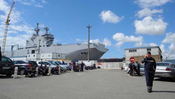 Фото: France 24 Комментарий редактора: До того как морякам позволили взойти на палубу, официальный представитель МИД Франции Ромэн Надаль рассказал, что россияне продолжают проходить в Сен-Назере подготовку. «Насколько я знаю, российские моряки по-прежнему проходят обучение, их подготовка продолжается», — сказал он журналистам.