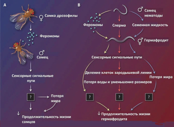 Половые феромоны самки дрозофилы представляют собой нелетучие углеводы, которые выделяются на поверхность кутикулы. Самцы воспринимают их специфическими вкусовыми рецепторами, расположенными на передних ножках. За эффект сокращения жизни ответственны ген ppk23 и фактор плодовитости fru – регулятор транскрипции. Эти гены работают в нейронах рецепторов и определяют устойчивость к стрессу и продолжительность жизни. Феромон самки активирует ppk23 и fru, что сокращает продолжительность жизни и вызывает истощение самцов.