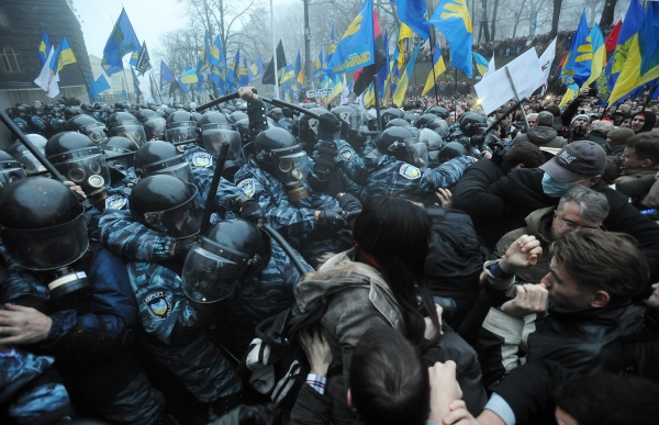 Во избежание возможных потасовок митинги властей и оппозиции, проходившие на расстоянии в несколько сотен метров друг от друга, отделяла плотная колонна милиционеров и бойцов спецподразделения «Беркут». Штурмовать ее никто не стали ни с одной, ни с другой стороны - акции в Киеве проходили мирно. Единственный инцидент - получасовая драка между бойцами «Беркута» и радикально настроенными националистами из партии «Свобода» у стен кабинета министров. Оппозиционеры хотели захватить здание правительства и стали травить правоохранителей слезоточивым газом. «Беркут» ответил тем же. Со стороны демонстрантов в сторону спецназа полетели булыжники и дымовые шашки. «Беркут» защищался, но жестких репрессий и «мочилова» с его стороны не последовало.
