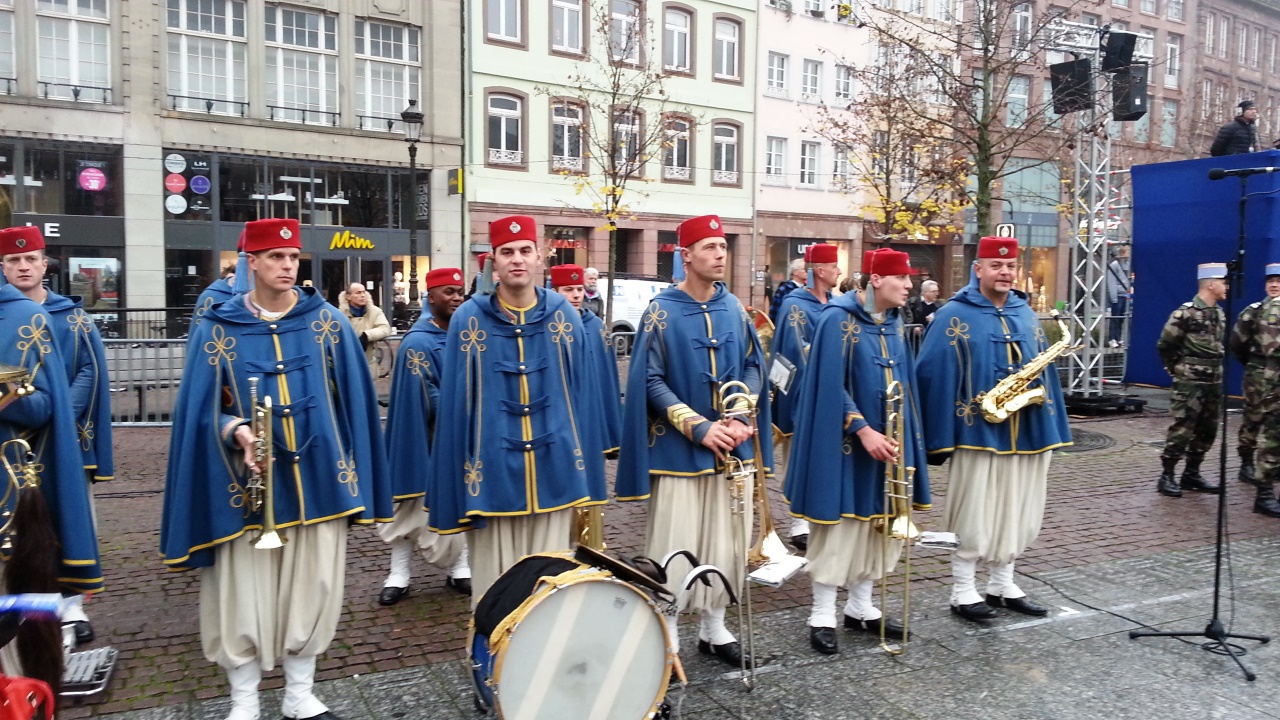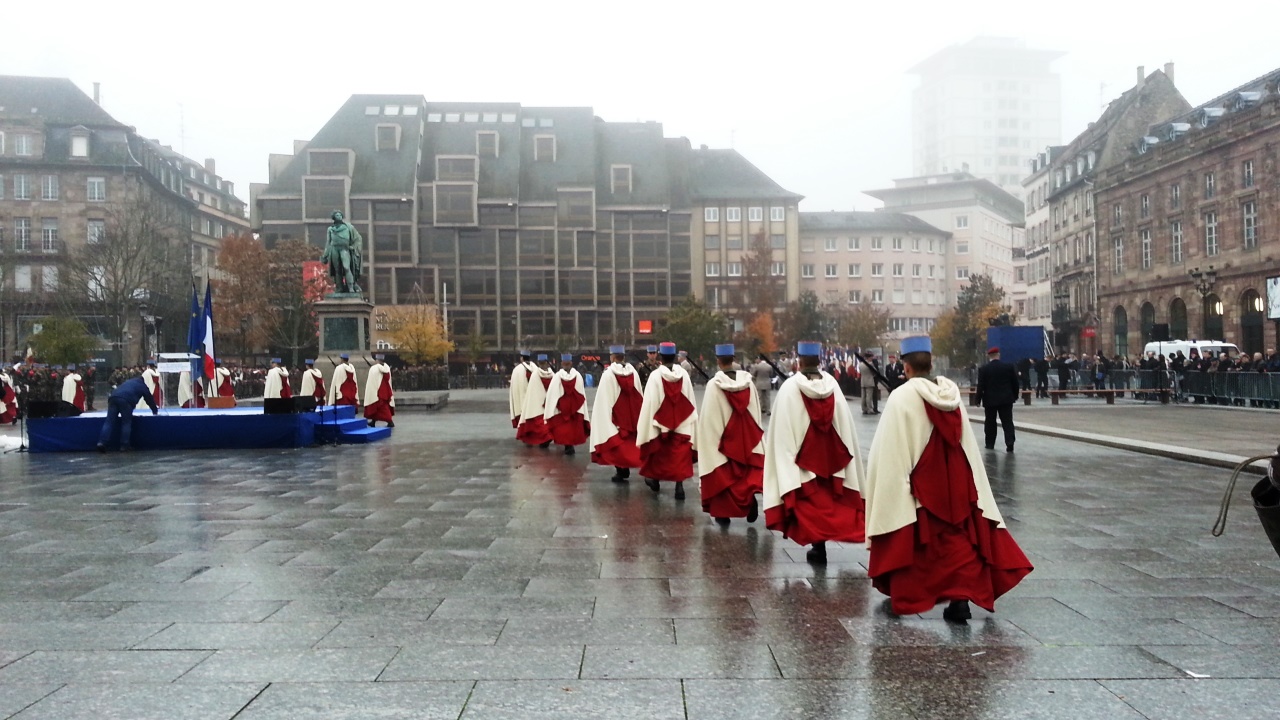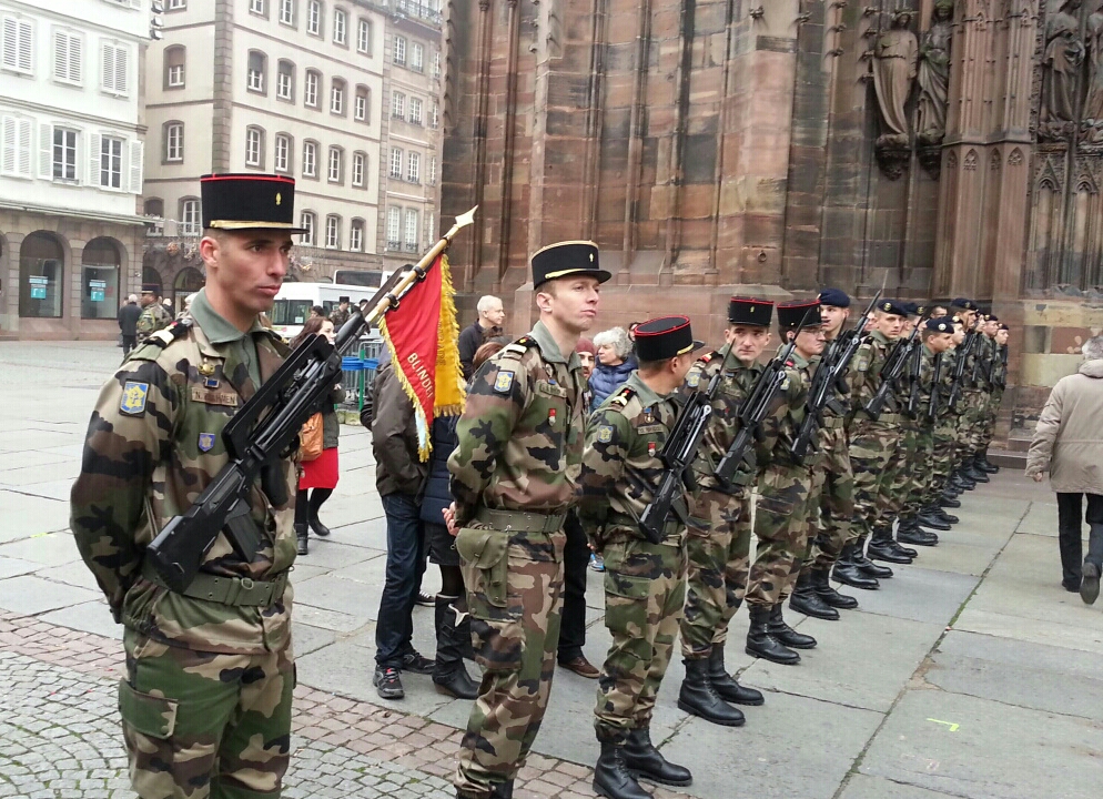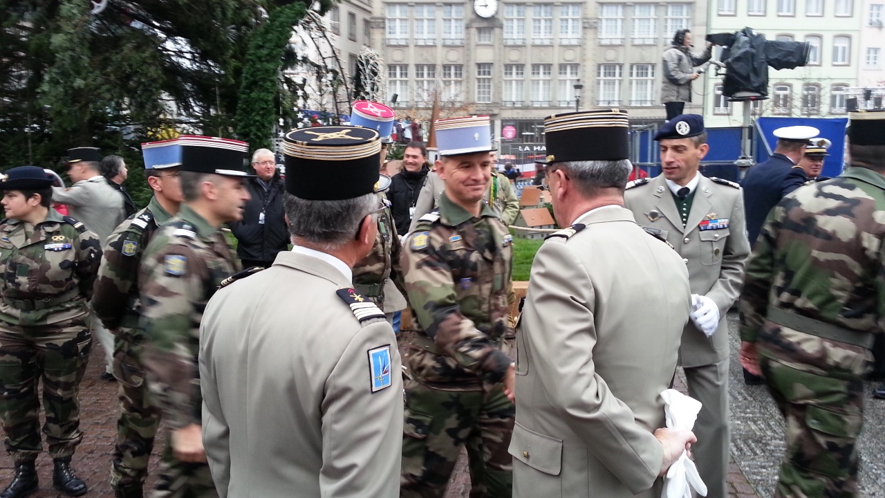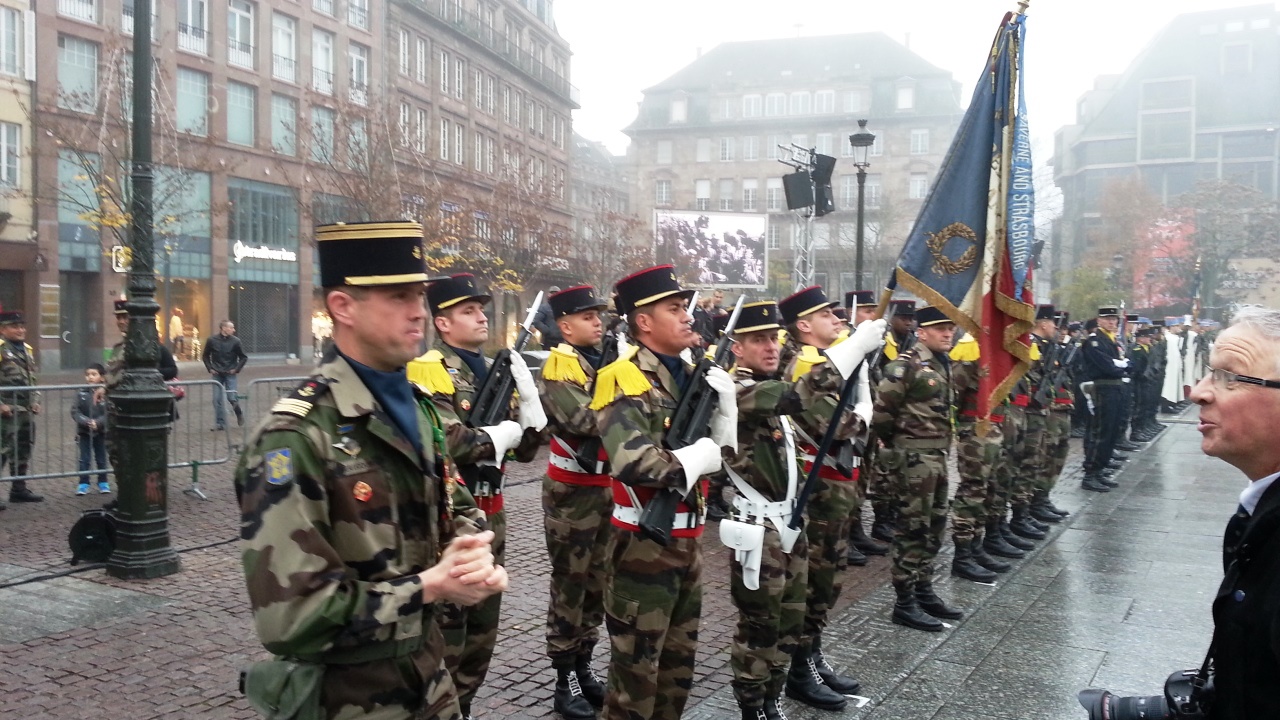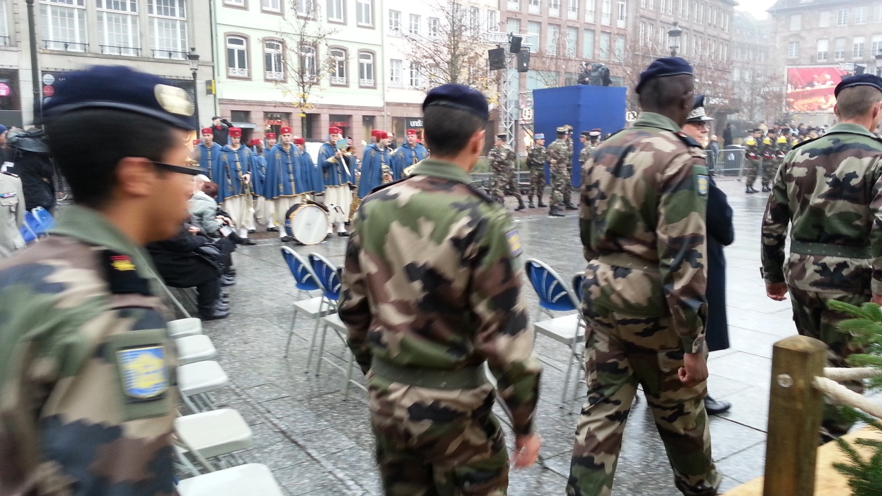 На параде выступил министр обороны Франции Жан Ив Ле Дриан. Перед этим он обошел все шеренги, выстроившиеся на площади Клебер. Он немножко похож на Виталия Коротича. Я, конечно, не понимала, что он говорит, но потом прочла. Он заявляет, что те жгучие бои, которые развернулись в Страсбурге 70 лет назад, приобретают особую актуальность сейчас, во время борьбы против вооруженных исламских движений. Говорит, что за семьдесят лет мир значительно изменился, однако "наш общий враг, под разными лицами, оставался тем же: нетерпимость, расизм, фанатизм, варварство" и этот враг "сеет тот же ужас среди населения Европы". Он также заявляет, что Франция разделяет всю полноту ответственности в этом бою своими военными операциями в Мали, в Центрально-Африканской Республике, в Индийском океане и в последнее время также в Ираке, принимая участие в воздушных ударах против радикальных исламистов. Это идут представители именно современной французской армии.
