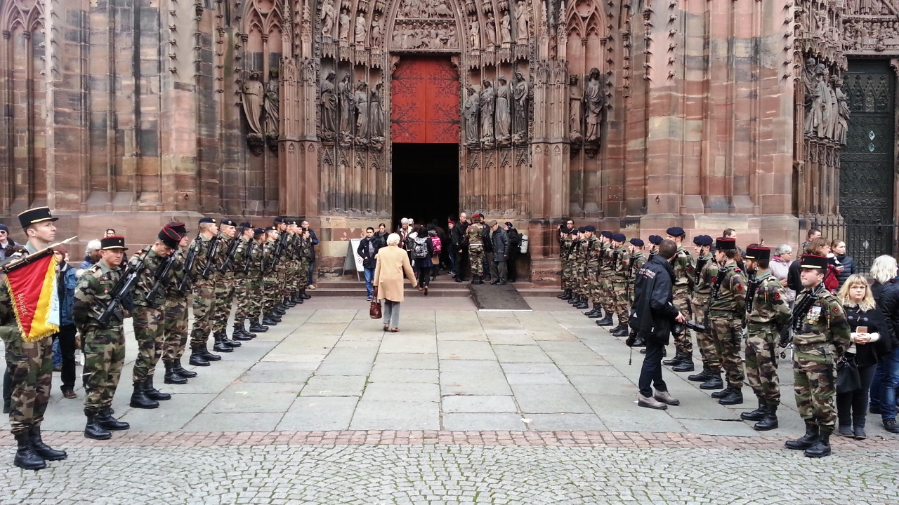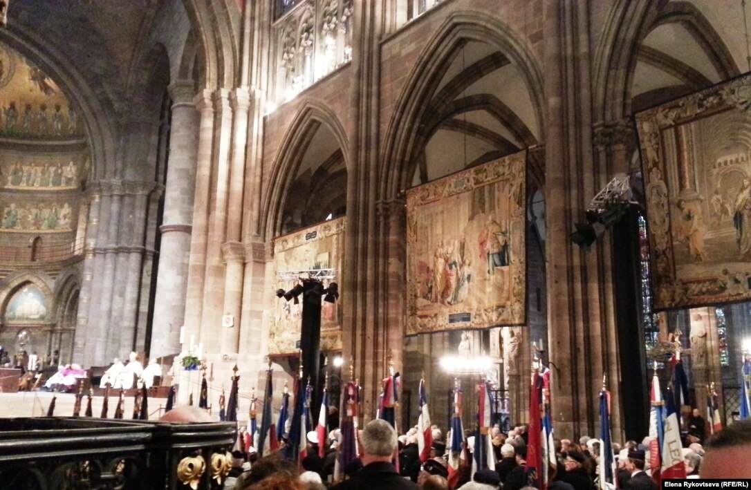 Дело в том, что еще в 1941 году генерал Лекруа заставил своих воинов произносить клятву: "Поклянитесь в том, что вы сложите оружие только тогда, когда наши цвета, наши красивые цвета, будут плыть над собором Страсбурга". Сегодня случилась эта символическая акция. Был туман, поэтому ее детали можно было разглядеть только по местному телевидению. Над собором с флагом Франции кружило какое-то летательное устройство, похожее на большого паука. Потом этот флаг сняли и внесли в собор. Туда же с парада пришли ветераны со своими знаменами. Состоялось торжественное богослужение памяти павших.