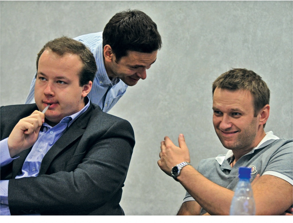 Георгий Албуров (слева), соратник Алексея Навального (справа) по Фонду борьбы с коррупцией, и оппоцизионер Илья Яшин (в центре) на заседании Координационного совета оппозиции. Москва, 18 мая 2013 г.