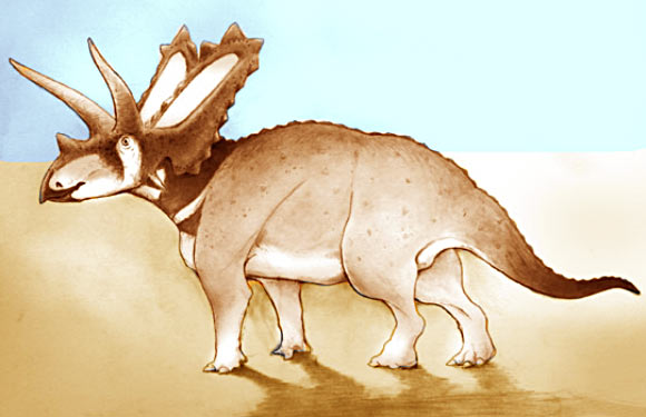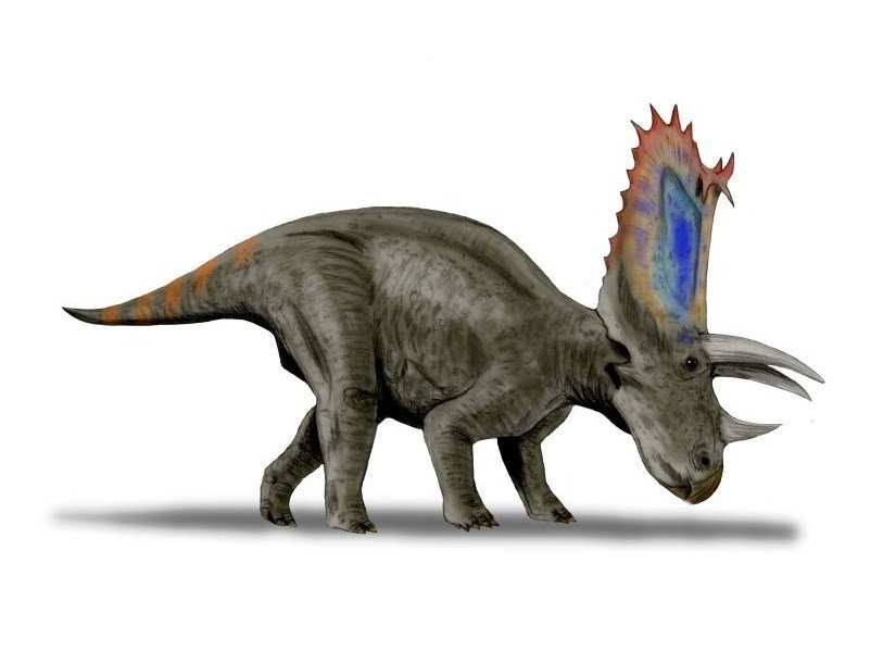 Pentaceratops aquilonius Первый из обнаруженных Лонгричем динозавров принадлежит к роду пентацератопс. Он получил название Pentaceratops aquilonius. Если трицератопсы, как видно из их названия, имели три рога на морде, то у пентацератопсов рогов было пять, точнее, три полноценных рога и два бугра на щеках. Наиболее близок к новому виду Pentaceratops sternbergii из Нью-Мексико, но Pentaceratops aquilonius был несколько меньше по размеру и отличался расположением рогов и формой зубчатого костного «воротника» на шее.