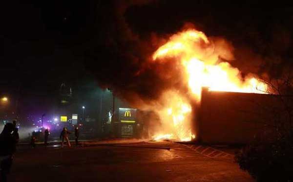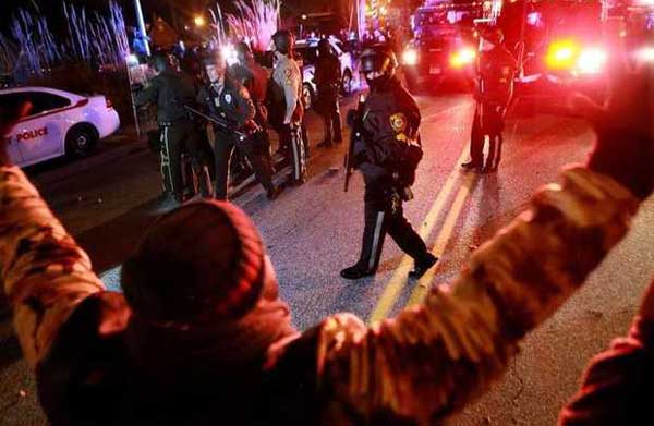 Демонстрации в Фергюсоне, где проживает примерно 21 тысяча жителей, начались 24 ноября, после того, как стало известно о решении коллегии присяжных. В ночь с понедельника на вторник протестующие сожгли более 20 зданий, а также переворачивали и поджигали полицейские автомашины, громили магазины, забрасывали камнями и бутылками здание полиции, где служит застреливший подростка полицейский. Властям штата Миссури, чтобы взять ситуацию под контроль, даже пришлось направить 2200 солдат нацгвардии на патрулирование улиц города.