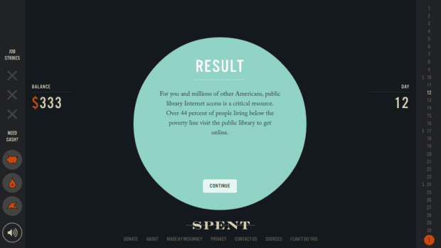 С помощью простой онлайн-игры SPENT прямо в вашем браузере можно научиться делать правильный выбор в сложных ситуациях и испытать на себе сложность жизни людей, которые находятся на грани бедности, а также понять, какие решения могут привести к финансовому краху.
