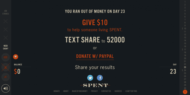 В конце игры, когда у игрока заканчиваются деньги раньше срока либо при удачном варианте, ему предлагается пожертвовать деньги тем людям, в реальной жизни испытывающих ситуации, о которых говорится в SPENT. Также можно поделиться результатом в социальных сетях со своими друзьями.