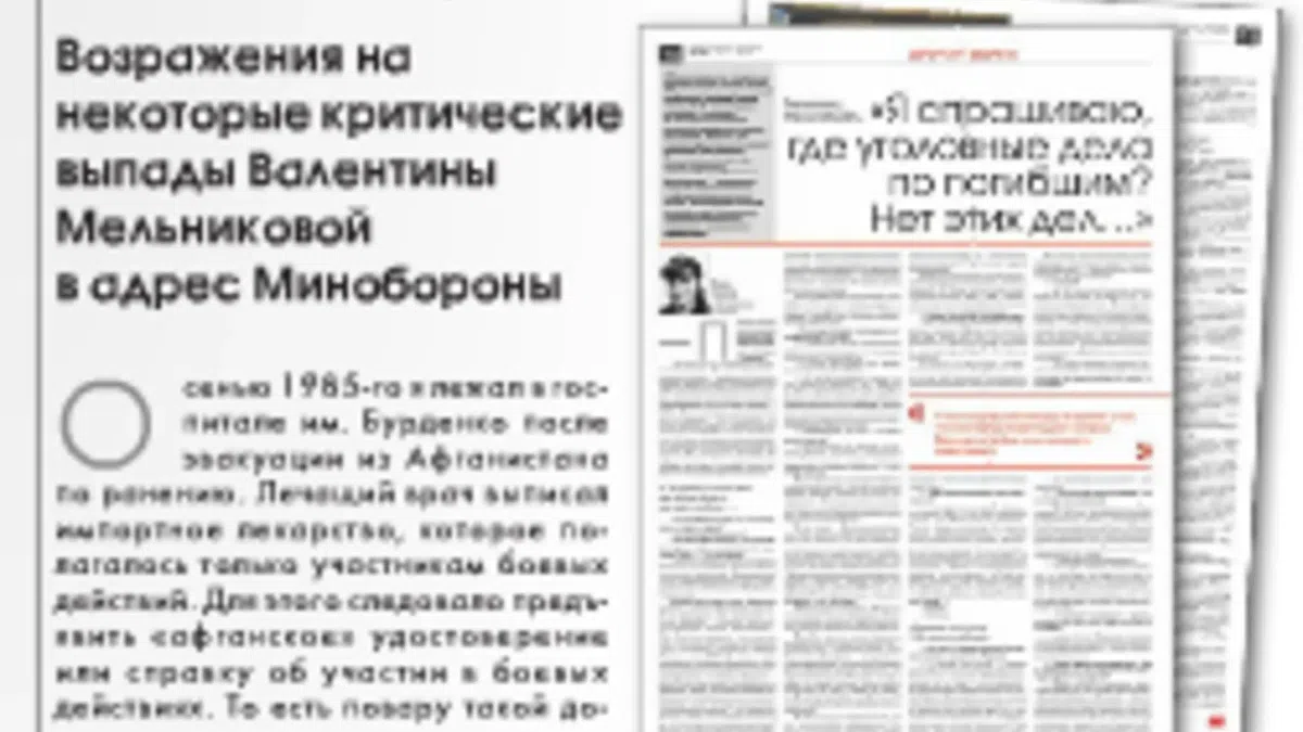 Через 10 дней после публикации моего интервью с ответственным секретарем Союза солдатских матерей (Валентина МЕЛЬНИКОВА: «Я спрашиваю, где уголовные дела по погибшим? Нет этих дел…». — «Новая газета», № 128 от 14.11.2014) в газете напечатаны «Возражения на некоторые критические выпады Валентины Мельниковой в адрес Минобороны» (см. «Новую», № 132 от 24.11.2014). Автор — Валерий Ширяев, рубрика — «Полемика с переходом на личности».