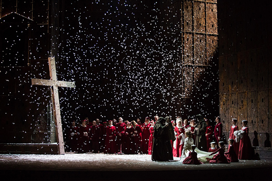 © Даниил Кочетков / Новая Опера Недолгое умиротворение в этот безвоздушный, нечеловеческий мир вносит отец Лоренцо, представленный эдаким продвинутым возрожденческим мыслителем. В его закутке, обрамленном античными капителями, нет распятия, зато есть глобус и телескоп. Огромный крест потом возникает в сцене неудавшегося бракосочетания Джульетты с Парисом; увидев мнимую Джульеттину смерть, ее отец богоборчески швыряет крест на землю — это, пожалуй, самый яркий режиссерский жест в этом спектакле.