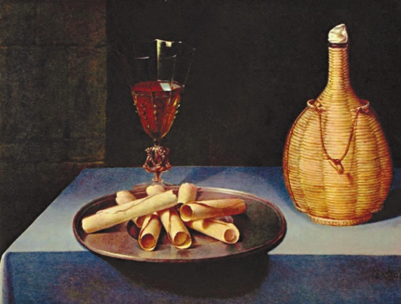 «Натюрморт с вафлями» не менее замечателен, прежде всего, лаконичностью и, разумеется, мастерством. Три простых предмета — тарелка с вафлями, бокал с вином и оплетенная соломой фляга — создают пространство холодноватой глубины.