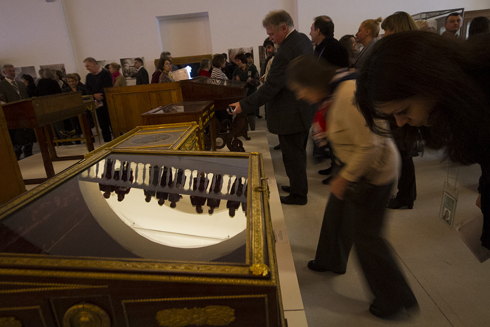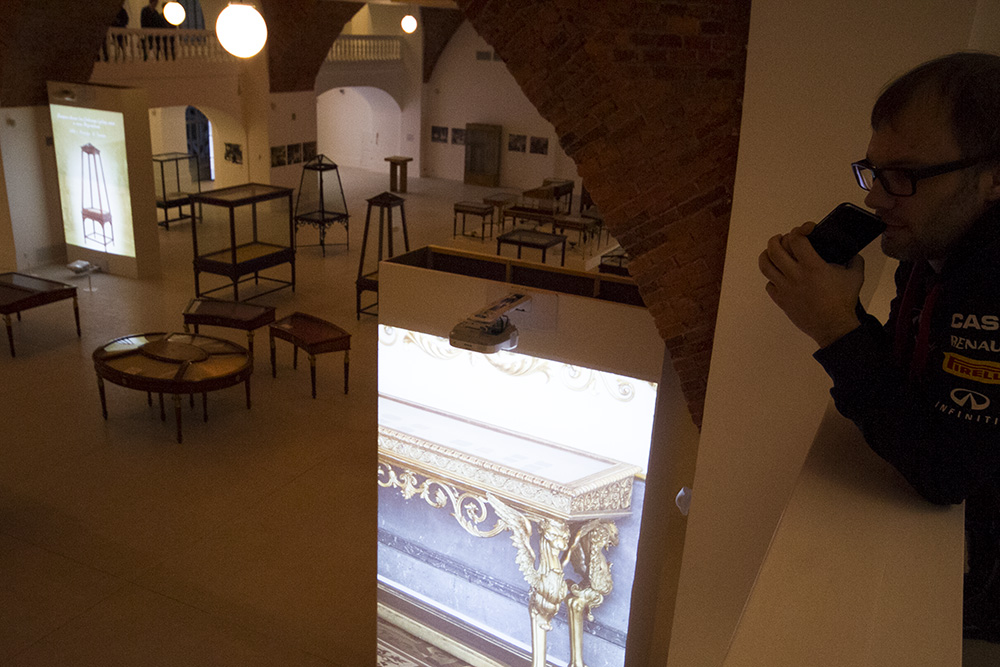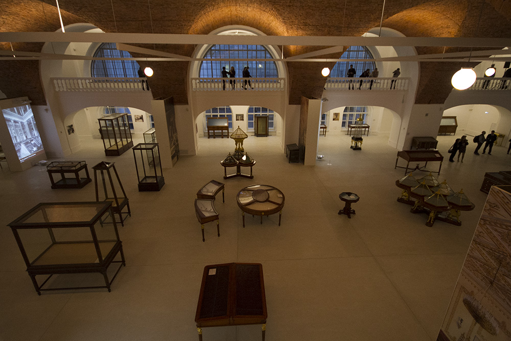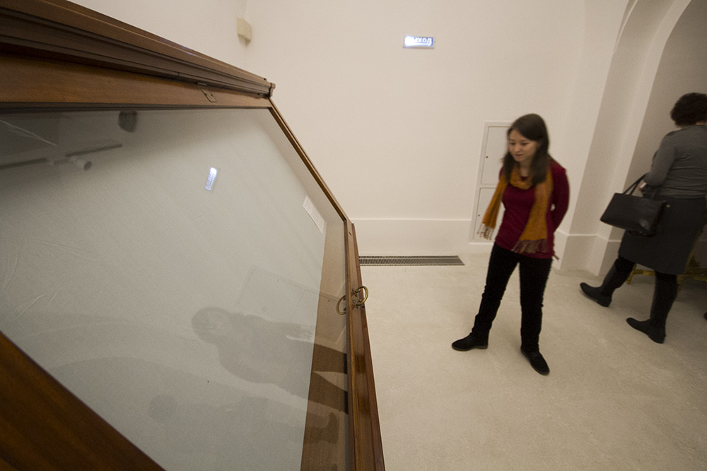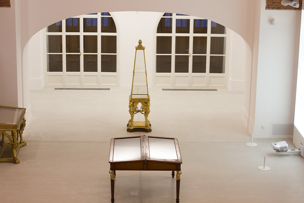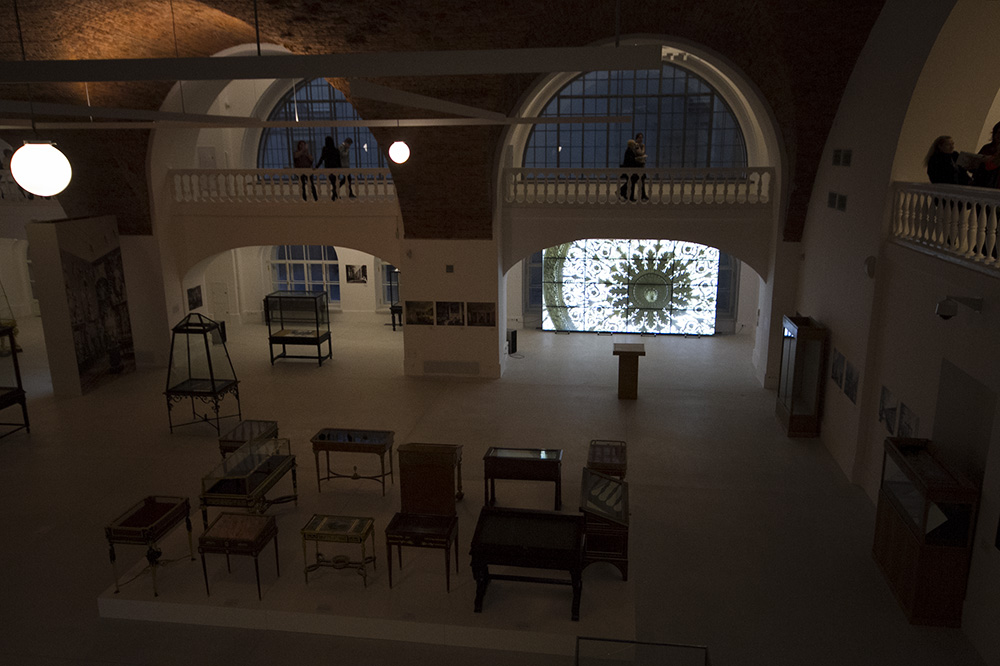 История Эрмитажа в зеркале витрин». По замыслу все того же Колхаса, экспонаты подобраны таким образом, что их формы, материалы, конструкции и декор являются отображением всех этапов существования Эрмитажа. В новом зале выставлены исторические витрины начиная со времен Екатерины II, основательницы музея, и до работ нашего времени. Современные кирпичные потолки, не впечатляющее освещение, много воздуха и зрители перед пустыми витринами —