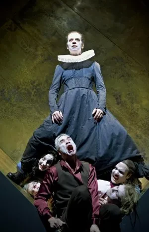Сценография Олафа Альтманна лаконична. Место действия — ниша в глухой стене. Стены «ниши» крыты тусклым золотом. В центре — протестантский крест. Старые деньги, новый дизайн, золотой миллиард… все смешалось в доме Оргона! И чем моложе его домашние — тем они нелепее, гротескнее, инфантильнее. Возлюбленная пара Марианна и Валер, пухлый сын-правдолюбец… Все эти броские живые куклы черной комедии явно несостоятельны как наследники. Куда им против Тартюфа! Чуть не эта беспомощность ближних Оргона и бесит. Он привык ценить силу.
