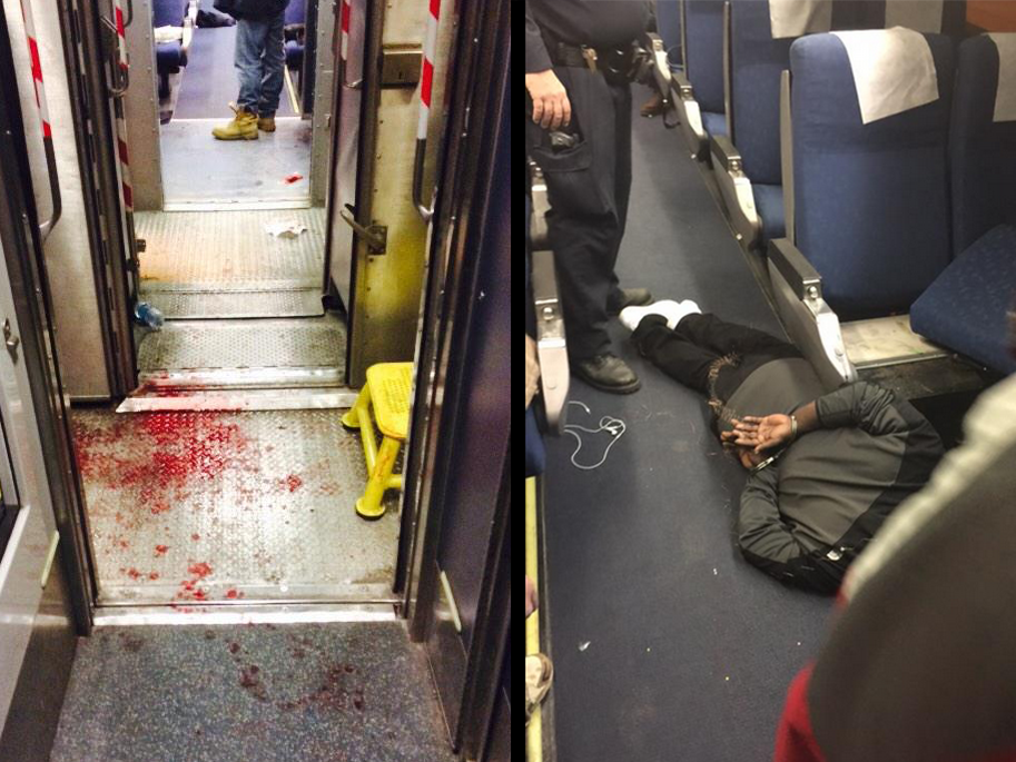 Ранее один из пассажиров опубликовал в своем Twitter фото человека в серой куртке лежащего на полу поезда лицом вниз в наручниках. Другой пользователь выложил изображение со следами крови в тамбуре 364 поезда.