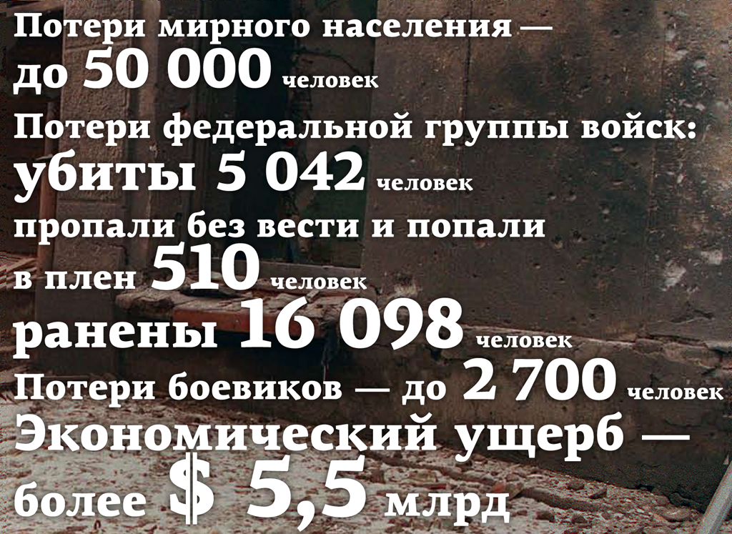 Потери среди мирного населения составили до 50 тыс. человек, у федеральной группы войск — около 6 тыс. человек, потери боевиков — около 2,7 тыс. человек. Война с короткими паузами продолжалась 1 год и 9 месяцев. Через три года началась Вторая чеченская война.