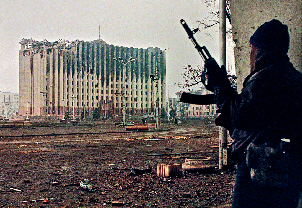 Боец вооруженных сил ЧРИ укрывается от снайпера рядом с президентским дворцом, Грозный, 10 января 1995 года. Фото: Михаил Евстафьев/AFP