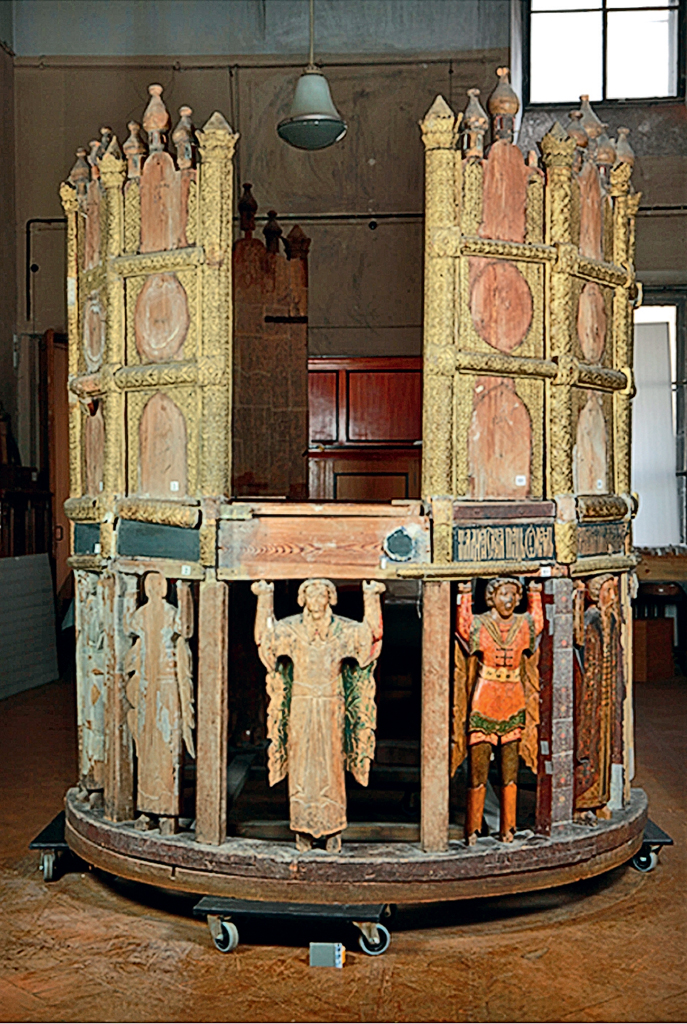 Резной золоченый амвон XVI века — редчайший из сохранившихся памятников церковной культуры. Самый ранний образец иконы «Святые Борис и Глеб», «Богоматерь Владимирская» Симона Ушакова, часовня-киот XVII века, резные деревянные скульптуры «старцев», шитье, литые изделия — всего около шестисот памятников древнерусского искусства. «Мы хотели, чтобы выставка напоминала экспозицию 1914 года», — сказала заведующая отделом древнерусского искусства Русского музея Ирина Соловьева. Тогда, 18 марта 1914 года, в анфиладе зал правого крыла Михайловского дворца торжественно открыли Древлехранилище памятников иконописи и церковной старины имени императора Николая II. Экспозиция была оформлена по проекту архитектора Алексея Щусева.