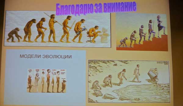 И, вместо заключения, такая «информация к размышлению». Физическая структура не остается чем-то застывшим, она меняется в соответствии с условиями жизни, эти изменения влияют на состояние здоровья, как мы с вами видели, на состояние физической крепости, и знаменитая фраза «Рост – это зеркало происходящих в обществе процессов» - это характеристика нашей онтогенетической пластичности по сути. Быстрого приспособления к меняющимся условиям жизни. Очевидно, что это – один из аспектов нашего эволюционного наследия. На этом позвольте закончить. Здесь – такие смешные картинки модели эволюции. Благодарю вас за внимание.