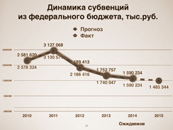 Динамика субвенций из федерального бюджета в бюджет области представляет собой четкую тенденцию к снижению в течение всех последний четырех лет (от 3 млрд 130 млн 571 тыс. руб. в 2011 году до 1 млрд 590 млн 234 тыс. руб. в 2014 году). На 2015 год запланировано ещё меньше – 1 млрд 485 млн 344 тыс. руб. Субвенция – это деньги, которые выделяются от вышестоящего бюджета к нижестоящему строго на целевые расходы. Псковский областной бюджет очень сильно страдает от стабильного снижения субвенций.