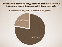 Сравним собственные доходы в проекте бюджета на 2015 год: 4 млрд 198 млн руб. – это два городских округа и 24 муниципальных района – и 14 млрд 873 млн руб. – это собственно бюджет области.