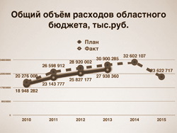 В течение всех последних четырех лет фактические расходы областного бюджета были меньше, как правило, на 2-3 миллиарда рублей, чем запланированные, то есть Псковская область хронически испытывает недостаток финансовых средств для реализации целей бюджетной политики. Максимальный объем доходов областного бюджета был запланирован на текущий, 2014-й, год – 32 млрд 602 млн 107 тыс. руб., на будущий 2015 год планируется самое крупное за последние десятилетия снижение расходов примерно на 9 млрд рублей, связанное со значительным снижением доходов бюджета.