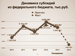 Субсидии из федерального бюджета – это средства, предоставляемые на соответствующие цели, как правило (но не всегда), связанные с различной материальной помощью гражданам. Мы имеем по субсидиям нестабильную картину, в 2014 году по этой статье в бюджет области поступило 2 млрд 963 млн 661 руб., на данный момент федеральный бюджет вообще не определился с субсидиями на 2015 год, и в проекте бюджета, внесенном в областное Собрание депутатов, их только 146 млн руб. – это критично мало, картина по субсидиям фактически неясна.