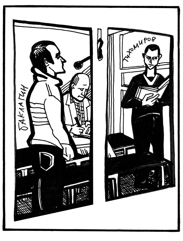 Баклагину задавали уточняющие вопросы и зачитывали некоторые показания, данные им на следствии (с теми, что он дал сейчас, они совпадают вплоть до отдельных формулировок). Он попытался выгородить Тихомирова — такого же, как и Исаев, друга своего детства. Тихомиров, по его словам, еще в школьные годы получил прозвище «эстонец» за медлительность. Тихонов и Коршунов за своего его не считали и близко к себе не подпускали. А в убийство антифашиста Джапаридзе вовлек Тихомирова Баклагин, буквально сломив его волю — «он такой безынициативный» (Тихомиров стрелял антифашисту в голову, а добивал его ножом уже Баклагин).