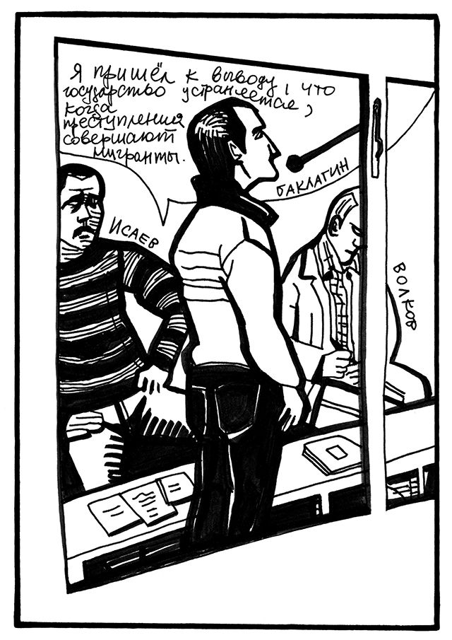 На прошлом заседании Баклагина прервали буквально на полуслове. 10 декабря он продолжил рассказ событиями весны 2010 года. Тогда на сайте Lifenews он обнаружил историю о том, как некто Сосо Хачикян, 47-летний таксист, избил продавщицу салона «Евросеть» до такой степени, что у нее случился выкидыш. «На Lifenews было видео, где Хачикян рассказывает, что он сделал, и мне показалось, что он бравирует. Я очень возмутился его поступком и тем, что он на свободе, а не в изоляторе. В очередной раз убедился, что государство устранилось от проблемы мигрантов. У них же диаспоры сильны, вот я и пришел к умозаключению, что он отделался с помощью банальной коррупции. На следующий день я встретился [с еще одним подсудимым Вячеславом] Исаевым и предложил убить Хачикяна», — довольно безучастно рассказывал Баклагин.