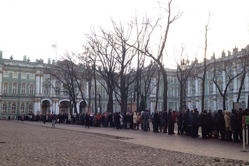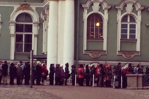 Перед Государственным Эрмитажем выстроилась длинная очередь. По словам очевидцев, поток людей тянется от входа в музей и до ворот, выходящих на Дворцовую площадь. Многолюдность в будний день связана с заявленной ранее акцией — по случаю 250-летия музея вход в Эрмитаж 10 декабря объявлен бесплатным.