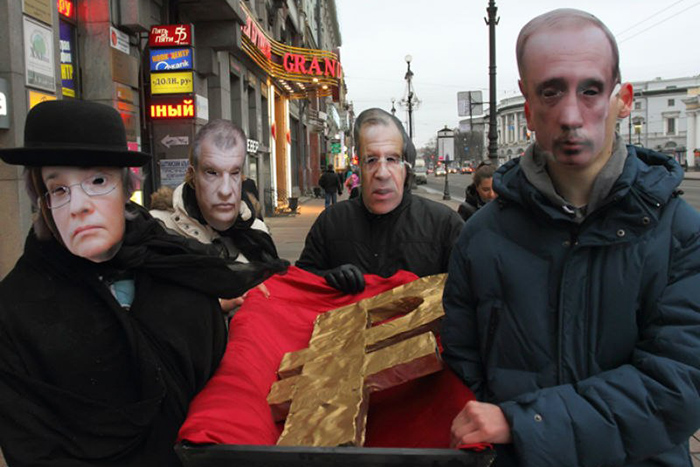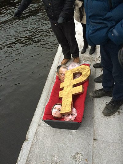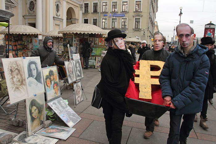 10 декабря сотрудники полиции задержали одну из участников акции «Свободное плавание и похороны рубля» Марию Дубкову. Об этом сообщают в группе помощи задержанным. Ее остановили во время одиночного пикета на Невском проспекте и доставили в 78-й отдел полиции УМВД России по Центральному району Петербурга. Там на Дубкову составили протокол об административном правонарушении по ст. 20.2 ч. 5 КоАП («Нарушение порядка проведения митинга, собрания»), после чего отпустили. Ранее в отдел полиции попросили явиться Вадима Суходольского и Александра Гудимова. Там им рассказали, что об акции в правоохранительные органы заявил «некий гражданин Смирнов», однако не назвал конкретных имен участников. На них также составили протоколы об административном правонарушении. Как рассказал «Бумаге» Суходольский, полицейские вызвали его для дачи объяснений через два дня после акции.Теперь активисты собираются оспаривать протоколы о правонарушении в суде, так как, говорит Суходольский, акция не была демонстрацией: на ней «не было ни флагов, ни плакатов». Акция прошла 6 декабря. Активисты в масках Владимира Путина, Эльвиры Набиуллиной, Сергея Лаврова и Игоря Сечина пронесли по Невскому проспекту открытый гроб, в котором лежал гигантский рубль. У Троицкого моста его спустили в Неву.