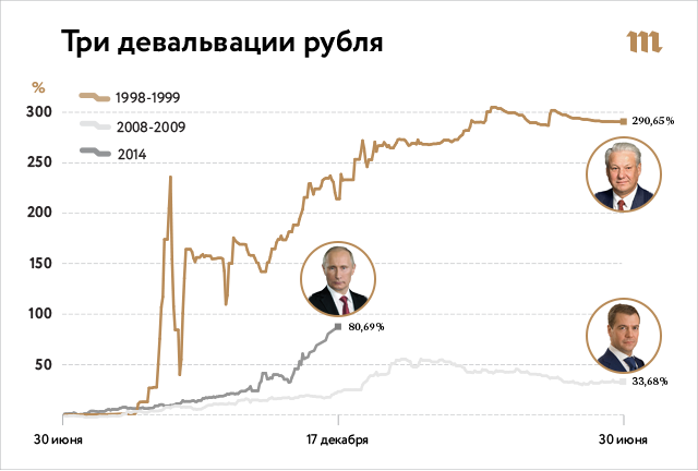 Резкое ослабление рубля в течение нескольких месяцев — нередкое для России явление: девальвации происходят раз в шесть-семь лет. «Медуза» показывает график падения рубля относительно американского доллара за три кризисных периода: с июля 1998 года до конца июня 1999-го, с июля 2008-го по июнь 2009-го и с июля по декабрь 2014-го. Публикация инфографики состоялась 12 декабря, с тех пор она регулярно обновляется.