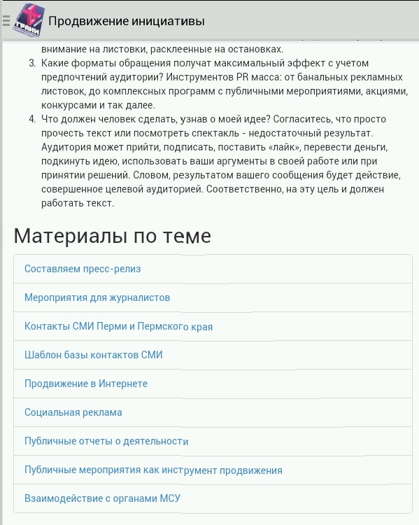 В этом разделе вы найдете подробные рекомендации по написанию пресс-релиза, а также базу контактов СМИ Перми и Пермского края – пожалуй, только в этом пункте можно заметить локальность приложения.