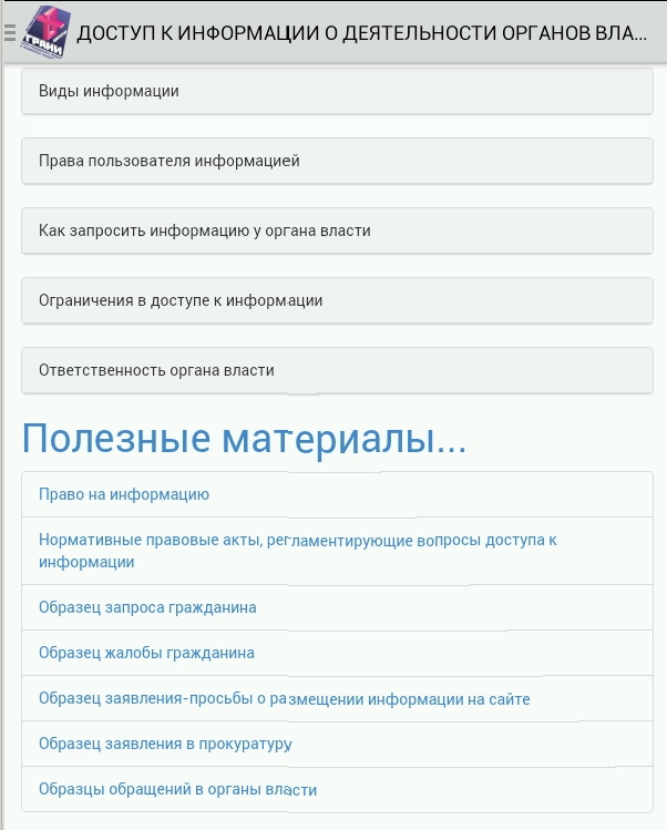 Важный пункт – «Доступ к информации о деятельности органов власти». Здесь не только перечислены все права граждан на получение информации от властей, но приводятся советы, как ее получить, и выложены образцы запросов, жалоб и даже обращения в прокуратуру.