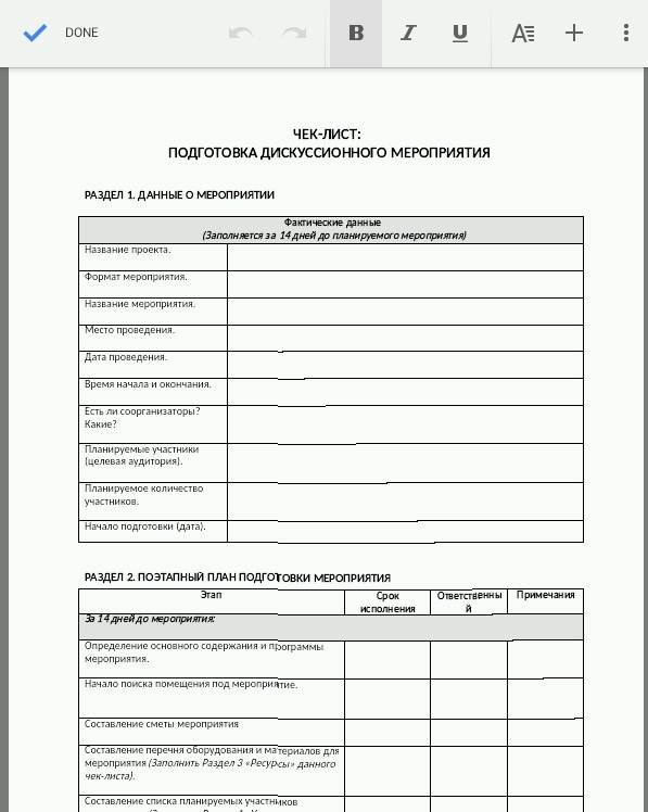 Для открытия некоторых пунктов вам потребуются дополнительные приложения на вашем смартфоне. Например, «Чек лист подготовки» – это документ doc, а «Шаблон расчета бюджета мероприятия» – таблица. Для их открытия достаточно бесплатных приложений от Google: Docs и Sheets. Преимущество использования этих форматов документов в том, что любой из них можно скопировать в Google Drive и использовать в своей работе уже с ПК.
