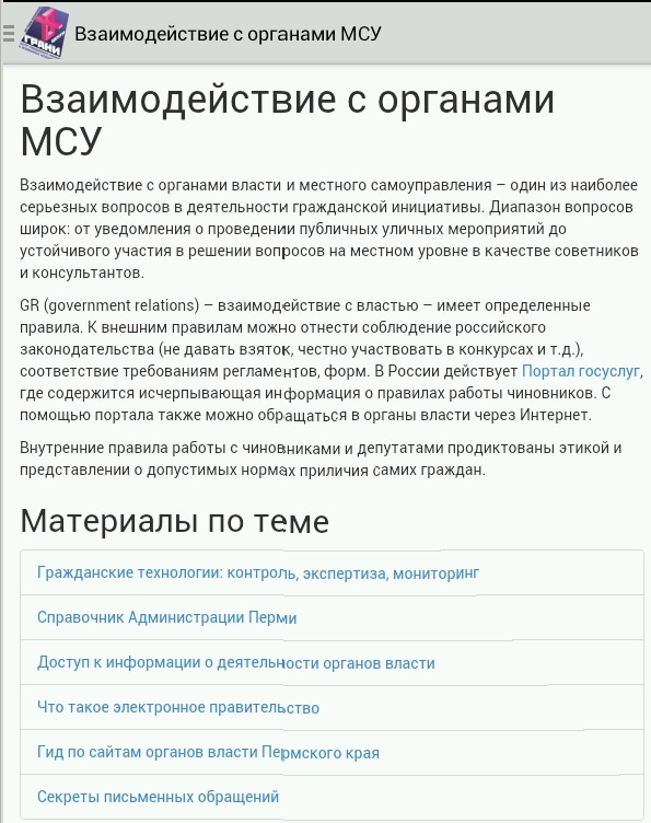 Последний раздел «Взаимодействие с органами местного самоуправления» посвящен взаимоотношениям с органами власти.