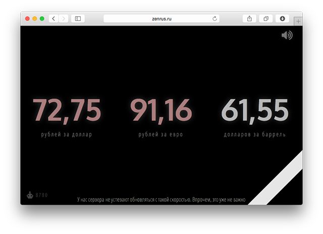 Медленно накатываются волны, падает снег в горах, горит в камине огонь, звучит успокаивающая музыка. Поверх этого — три цифры: доллар, евро, нефть. Сайт «Российский дзен», сделанный программистом Михаилом Лисняком, по его собственным словам, за один вечер, идеально соединил форму и функцию: необходимый информационный минимум, который ужался к концу года до трех цифр, то чувство, с которым ты смотришь на эти цифры, и тот образ, в котором зафиксировано это чувство.