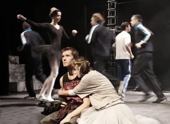 В пьесе Ольги Мухиной у мирных обывателей фамилии сугубо оружейные: Стечкины, Макаровы, Токаревы. (А сколько еще осталось невоспетых конструкторов!). Катит на роликах генеральская дочь Лариса Токарева (Серафима Огарева), великая любовь Алеши. Везут в Москву первые мешки с героином: папа Ларисы, собственно, и везет. А резко обнищавший папа Алеши, советский олимпиец и герой защиты Белого дома, разгружает эти мешки за 100 баксов. Общая фрустрация 1992—1993 годов, темная Москва, подсвеченная фарами «бумеров», разорение и поражение показаны четко — физически и пластически.
