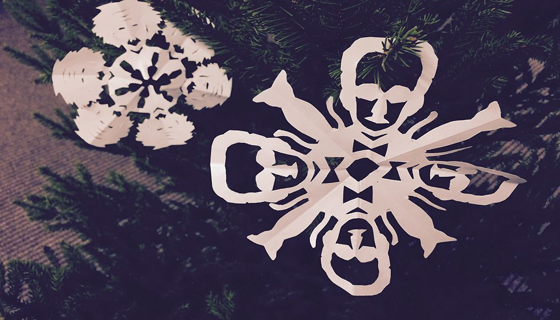 Чтобы получить снежинку, нужно распечатать шаблоны, сложить их по шагам, прописанным на самих листках, и аккуратно вырезать все серые области. Для некоторых элементов — глаз, очков, бровей — понадобится канцелярский нож.