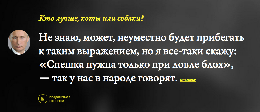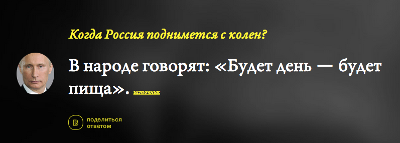 Издание ВОС (бывший W-O-S) проанализировало выступления Владимира Путина за 15 лет и создало генератор его ответов. Пользователь может ввести любой интересующий его вопрос — и получить жизненную мудрость от президента.