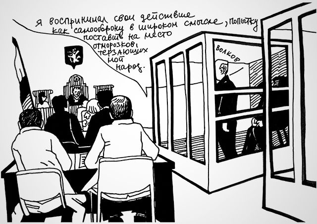 «Я воспринимал это как самосуд, персональную точечную месть, — Волков, сбиваясь, объяснял суду и присяжным свои мотивы. — Если хотите, это была самооборона в широком смысле этого слова. Это была попытка защитить город и простых граждан от несправедливости, поставить на место отморозков. Бессилие человека перед мощью обстоятельств — я и сейчас это ощущаю. Прошу дать адекватную оценку тому, что произошло».