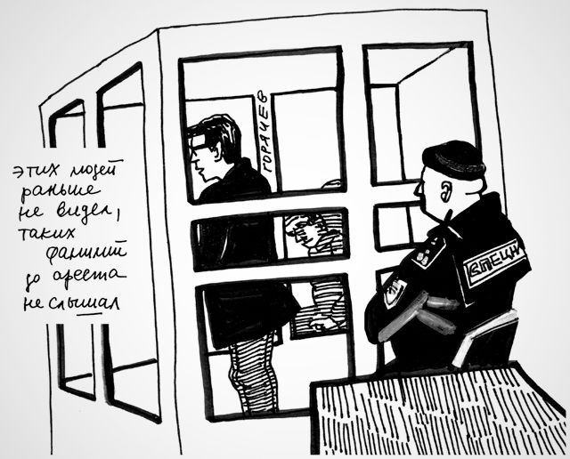 В Мособлсуде он занял место в том же аквариуме, где находились во время допроса Тихонов и Хасис. Аккуратный молодой человек в очках демонстрировал готовность рассказать судье все, что знает. Но сначала его резко ограничил судья Козлов: «Ответы будете давать только по тем эпизодам, которые вменяются подсудимым». Потом выяснилось, что и сам Горячев не очень-то много и знает. Точнее, не знает вообще ничего. С подсудимыми он не знаком, с Тихоновым дружит с начала нулевых и по-прежнему считает своим другом. С Хасис виделся пять или шесть раз, Горячев назвал ее «одной из пяти-шести сотен своих знакомых».