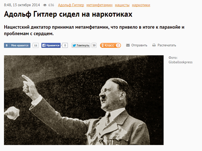 Солидную часть новостей на сайте РЕН ТВ составляют перепечатки таблоидов вроде Daily Star и их российских аналогов. В них, в частности, выясняется, что Адольф Гитлер был фанатом метамфетамина.