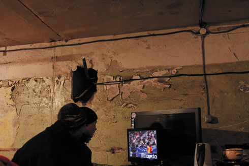 Вместе с волонтерами на западной окраине Донецка мы осматриваем два бомбоубежища на территории «Шахты челюскинцев». В общей сложности с родителями тут живут 20 детей. Старшие дети режутся в «плейстейшн», подключенную к большому ЖК-монитору. Со стен от влажности отваливается штукатурка, малыши резвятся на кровати, составленной из деревянных скамеек. Тут же сушится белье. Отец семейства сидит за компьютером в соседней комнате. У многих наверху осталось почти невредимое жилье, достаточно вставить рамы — и можно жить, но домой они возвращаться не спешат: «А вдруг опять начнется?»