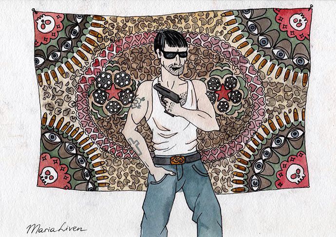 Он показывал мне шрамы от пуль. Одну из них он получил, когда сидел на пассажирском сидении в машине своего друга. Друга расстреляли. Объяснял значения своих татуировок. Я ничего не запомнила, кроме того, что их было много. Доставал какие-то фотографии. Пару из них я помню особенно чётко, где он — на вид совсем мальчишка — в тёмных очках и кожаной куртке стоит с двумя стволами на фоне ковра. Многим позже у меня появится знакомая, которая в девяностых была замужем за бандитом. У неё тоже все фотографии того времени были такими: ковры, стволы, а на столе — водка, кола и оливье.