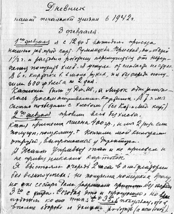 ...Когда нас посадили (служащего и иждивенца) на 125 г хлеба, то мы скоро осознали свое бессилие, пила падала из рук, папа с трудом колол дрова, а к середине декабря перестал носить воду из колодца. За период с 15 ноября по 15 декабря мы съели собаку и двух кошек...