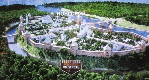 Начинается изложение истории Рюриковичей чуть ли не с кроманьонцев. Всюду инсталляции, подсветка, компьютеры… Кстати говоря, некоторые из компьютерных реконструкций откровенно поражают. В Интернете уже разошлась совершенно фантастическая выставочная реконструкция Новгорода XV века в виде Новгородского кремля (с постройками разных, в том числе и более поздних времен), окруженного непроходимыми лесами.
