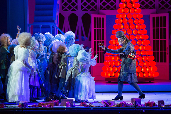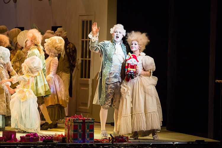 © Даниил Кочетков Пересочинением музыки Чайковского занимался опытный театральный композитор Игорь Кадомцев. Ее вербализацией — поэт Демьян Кудрявцев. Чтобы свежесочиненные и довольно затейливые стихи не страдали от недостатков вокальной дикции (которые, что уж там скрывать, имеют место быть), их дублируют титры над сценой. Впрочем, часто задирать голову нелегко, так как еще надо уследить за происходящим непосредственно на сцене. А там главные события — это костюмы от Павла Каплевича (он и постановщица Алла Сигалова — авторы идеи), феерия париков, корсетов и чепчиков для персонажей всех возрастов. Украшение этого действа — трогательные детские хоры с кружавчиками, рюшами и неформальными праздничными словами, которые, как знать, вполне могут в будущем войти в обиход детских елочных мероприятий.