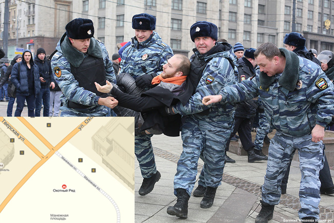 В минувшем году эта площадь стала центром московской протестной активности. У памятника Жукову в течение всего года регулярно проходили одиночные пикеты в поддержку болотных узников. Здесь у "олимпийских часов" протестовали против коррупции и вранья на сочинской Олимпиаде. В начале марта на Манежной состоялся массовый несогласованный сход против войны с Украиной. Количество задержанных на Манежке в конце февраля - начале марта перевалило за тысячу. Протесты проходили в форме крупных народных сходов, одиночных пикетов, театрализованных представлений (прогуливающийся в арестантской робе военный преступник Путин).