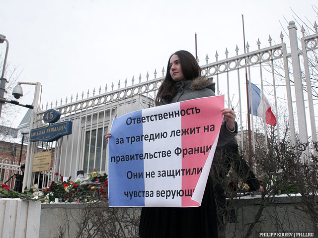 У посольства Франции в Москве активисты движения "Божья воля" во главе с Дмитрием Цорионовым, который более известен как Дмитрий Энтео, провели пикет против "кощунников из Charlie Hebdo". В редакции этого сатирического издания 7 января произошел теракт, жертвами которого стали 12 человек.