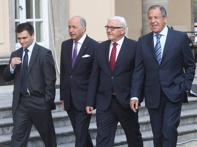 Франк-Вальтер Штайнмайер, Сергей Лавров, Павел Климкин и Лоран Фабиус начали переговоры на вилле "Борзиг" за закрытыми для прессы дверями около половины девятого по московскому времени, следует из сообщения ТАСС.