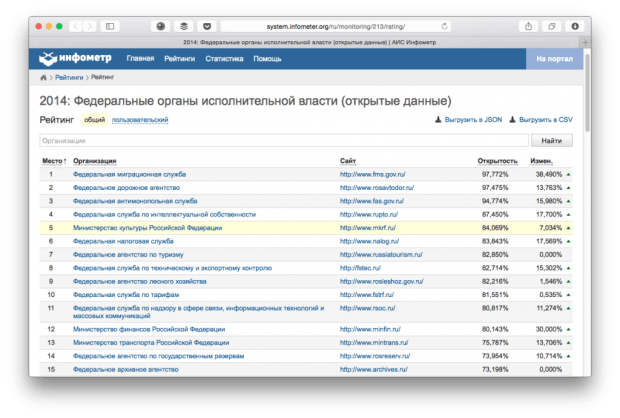 На сайте «Инфометр» можно также найти рейтинг федеральных органов исполнительной власти (например, по критерию открытых данных).